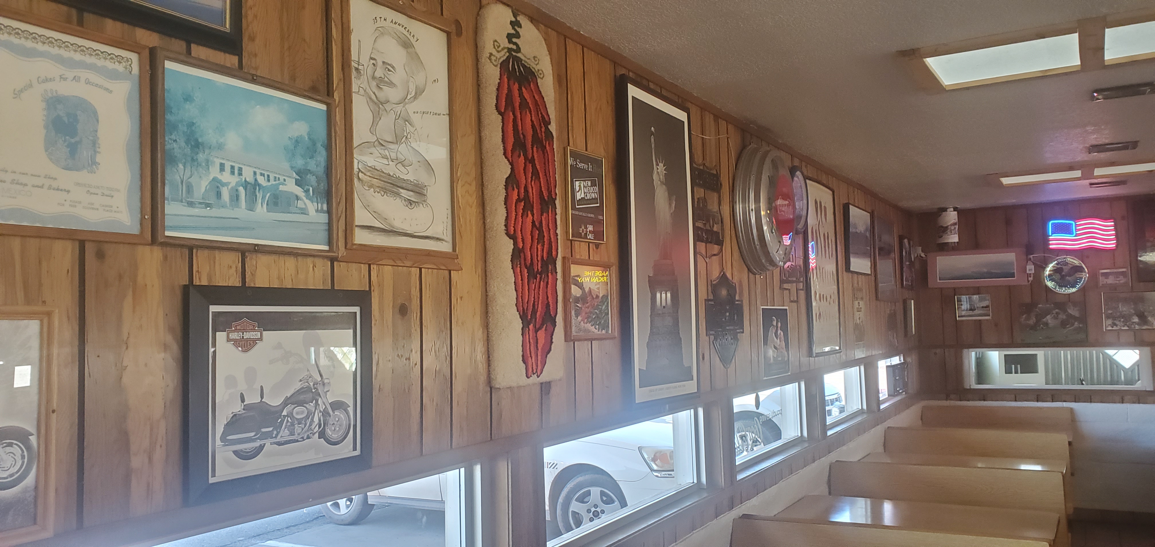 The walls of the restaurant are wood paneled and decorated with an eclectic mish-mash of various pieces of art, including drawings, painting, newspaper clippings, neon signs and metal art, among others. Perched in the middle of the dining room is a World War II era scooter.