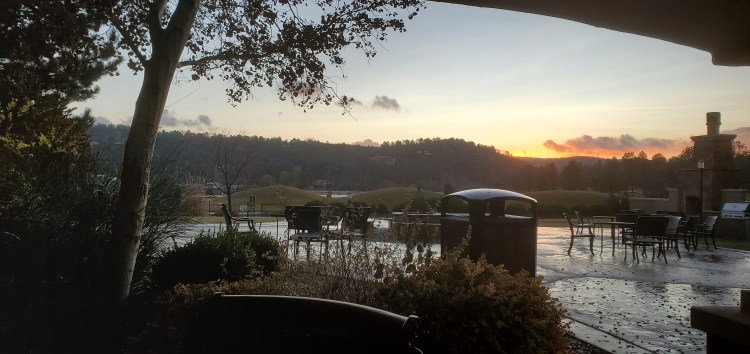 Sunday morning, we awoke to find that it had rained overnight. In fact, when I got up, it was still raining a bit. I quietly showered and got dressed then went to the lobby for a coffee before breakfast was served. I sat on the west-facing patio watching the light rain while the sun came up over the Sierra Blanca mountains. Once the sun got too bright for my oh-so-sensitive eyes, I moved in and finished my coffee in front of the fireplace in the lobby.