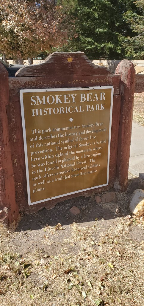We left Saturday morning and made the drive to Capitan, New Mexico, stopping to see the Smokey Bear Historical Park. The town of Capitan is very proud of its connection with the wildfire prevention campaign icon. The Smokey Bear Historical Park is on Smokey Bear Blvd, right down the street from Smokey Bear Motel and Smokey Bear Restaurant, and around the corner from Smokey’s Country Market.