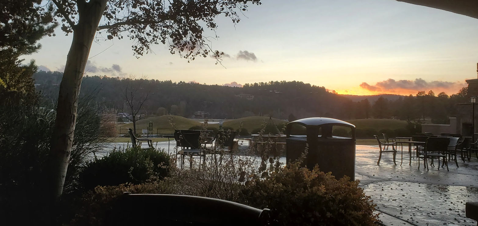 Sunday morning, we awoke to find that it had rained overnight. In fact, when I got up, it was still raining a bit. I quietly showered and got dressed then went to the lobby for a coffee before breakfast was served. I sat on the west-facing patio watching the light rain while the sun came up over the Sierra Blanca mountains. Once the sun got too bright for my oh-so-sensitive eyes, I moved in and finished my coffee in front of the fireplace in the lobby.