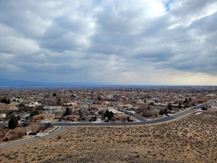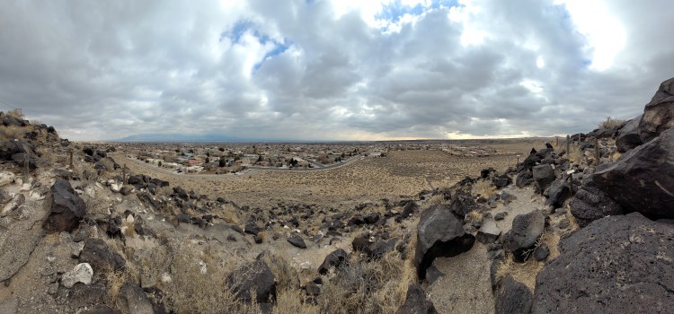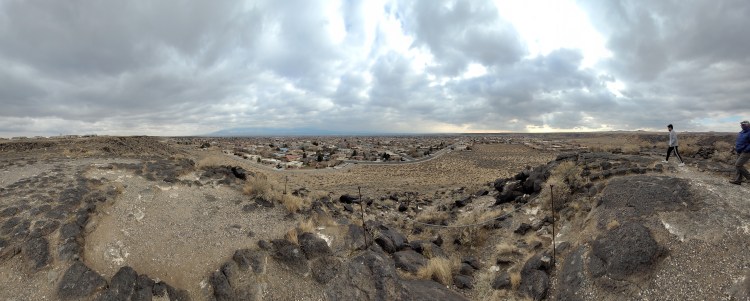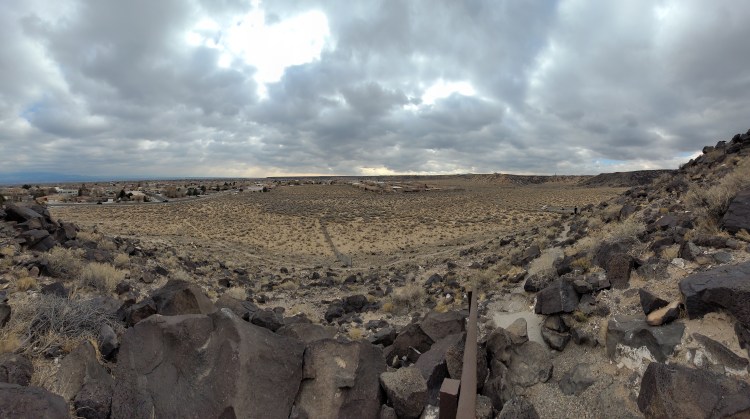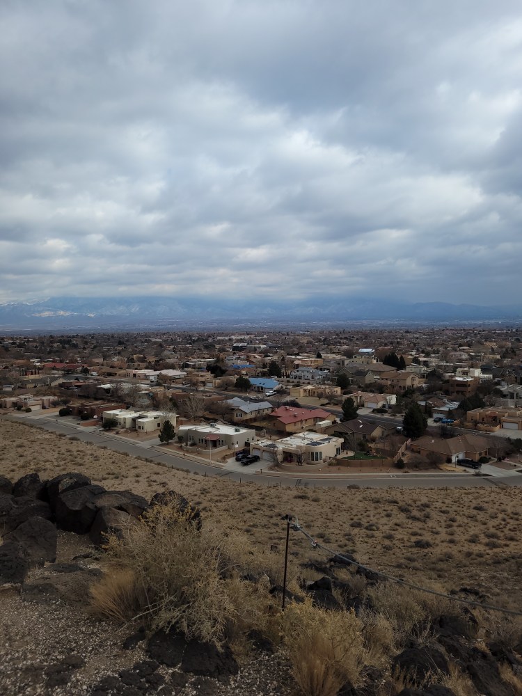 A little over halfway through the hike, we encountered a spur in the trail that took us further up the mesa for what would likely have been a wonderful vista of the Sandia mountains to the east, if not for the low clouds obscuring the view. We did get to see the Rio Grande Valley… and a lot of people’s back yards. The trails at Petroglyph are largely embedded in quite suburban areas.