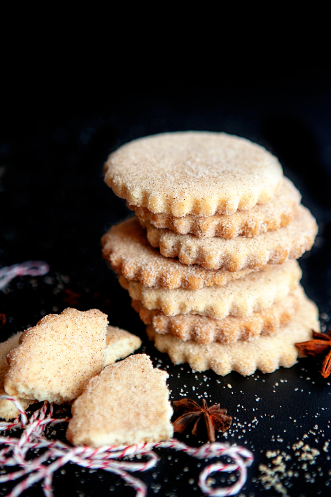 Usually cut into fluted circles, as seen above, or sometimes stars, the cookies are sprinkled with a cinnamon-sugar mix after baking.