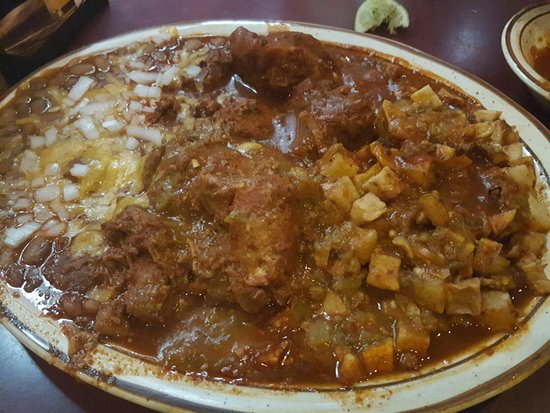 At most New Mexican restaurants, sopaipillas come with the entree you’ll order. Many times, they’re served at the end, almost like a dessert, but at many New Mexican restaurants, you can order stuffed sopaipillas as an entree, which are usually larger, opened and stuffed with a meat filling of your choice. My personal favorite is carne adovada (more on that later.) One of the most popular New Mexican restaurants in Albuquerque, Sadie’s, used to offer a “stuffed sopaipilla challenge” where if you could finish a SEVEN POUND stuffed sopaipilla in 60 minutes, you’d get it for free. Doesn’t seem to be a thing any more, but Adam Richman featured it for his Travel Channel show Man vs. Food Nation though he didn’t attempt the challenge.