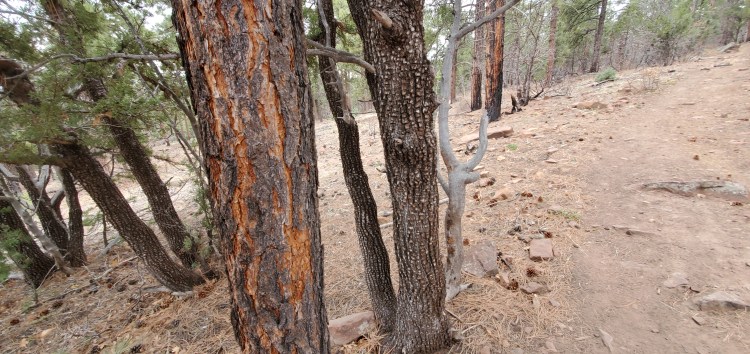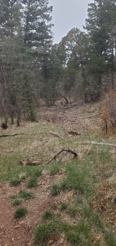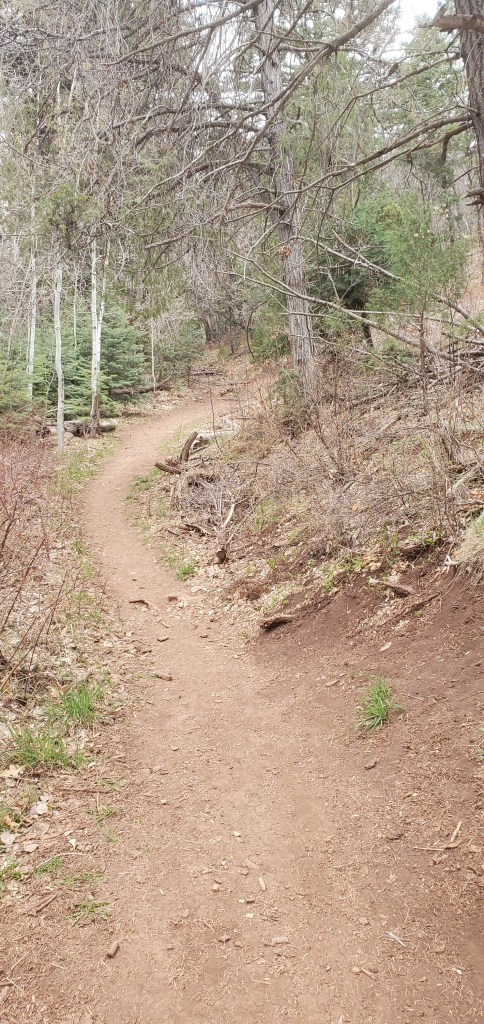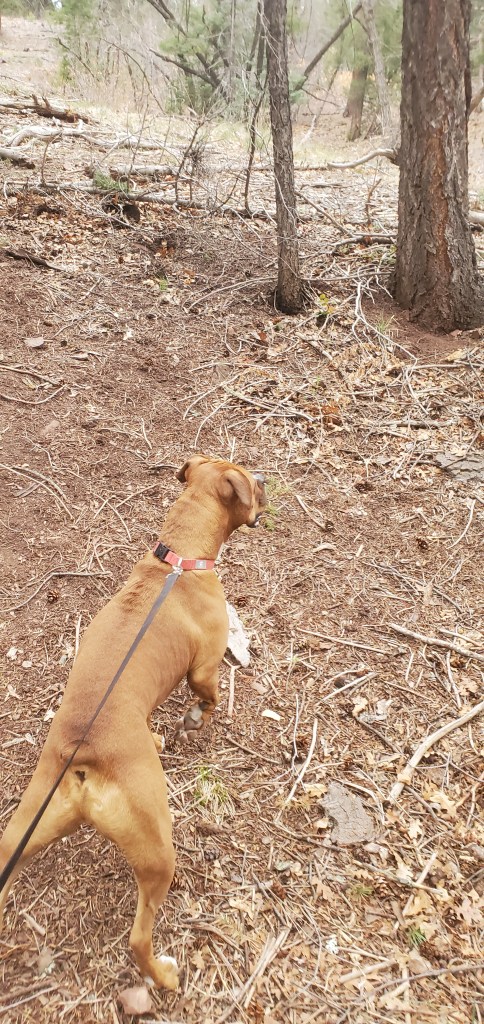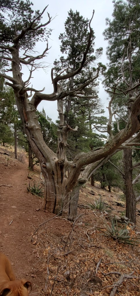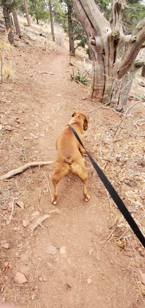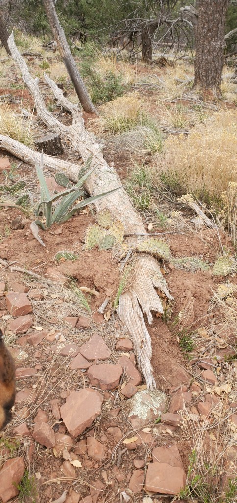 We meandered through Cibola National Forest on the Faulty Trail for a short bit before coming to the intersection with Cienega Horse Bypass Trail. The dirt trail eventually became littered with loose rock which became hazardous when I twisted my right ankle… three separate times. With Ash very full of energy, he was pulling hard on the leash making the hike even more treacherous.