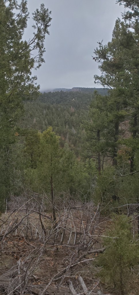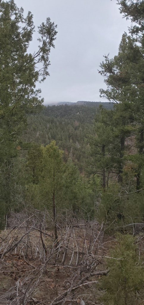 Peaking at over 7,600 feet, we were surrounded by some fantastic vistas of forest in every direction. The day was grey and cold with snow flurries from time to time as we walked. The low clouds hung just below the treetops at times giving the views an even more ethereal feel. It was quiet with only the sound of wind rustling through the leaves and birds calling from all parts of the forest.