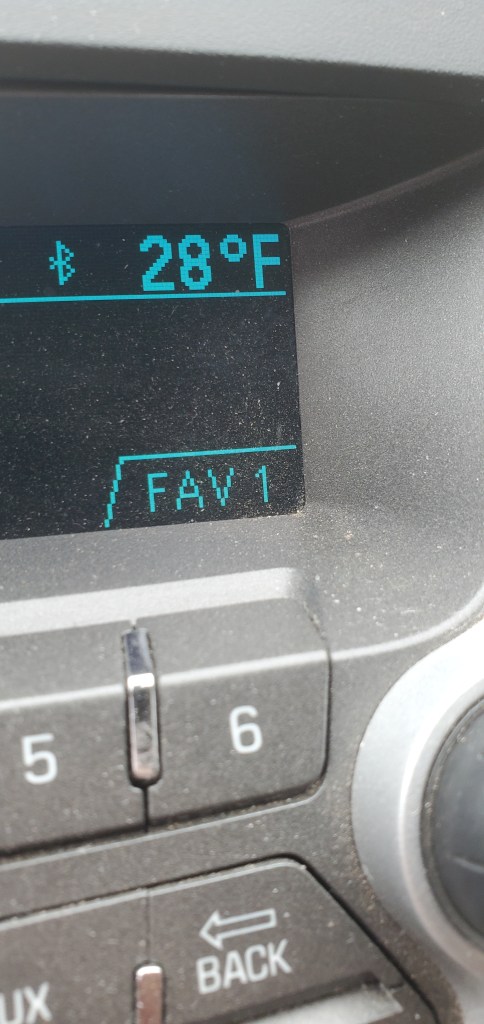 The trail finally emptied out onto a road that leads to a horse trailer parking lot. We walked down a hill finding ourselves in the parking lot for the picnic area where we started. We stopped at a picnic table so I could give Ash some water before we headed back up another incline to the car where my car told us it was 28 degrees.