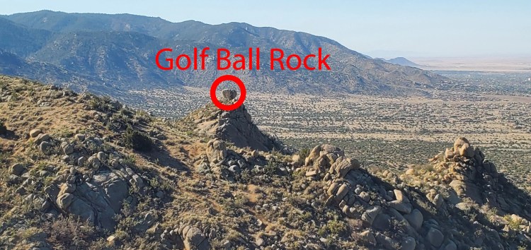 I was standing at a south-facing window which gave wonderful views of the rolling mountains leading down into Albuquerque. The operator gave us plenty of information about the tram and its history and readily answered any questions that were asked of him. One of the geologic features he pointed out was Golf Ball Rock, a round-ish rock balanced on the top of a small hill. The interesting part is that the rock is twice the size of the gondola in which we were riding.