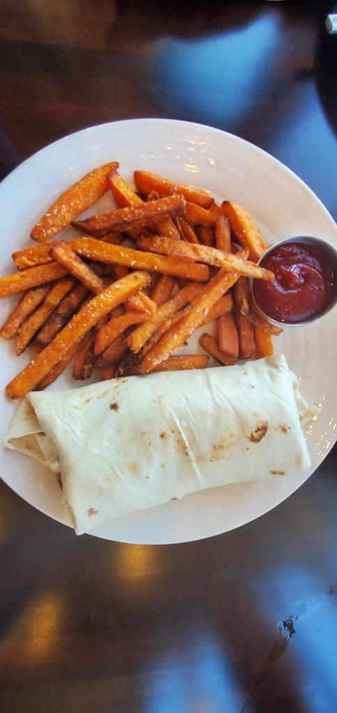 I have to say, I think this very well may be some of the best carne adovada I’ve ever had. The meat was super moist, very flavorful and the wrap was stuffed with a healthy amount of cheese. No filler, no frills, no excessive lettuce and tomatoes to get in the way. It was served simply and was absolutely delicious. The sweet potato fries were fine, nothing special about them, aside from the flaky salt they seasoned them with.