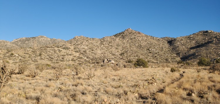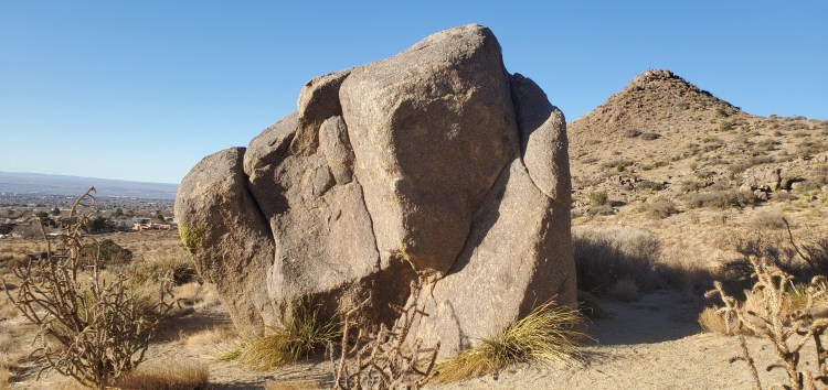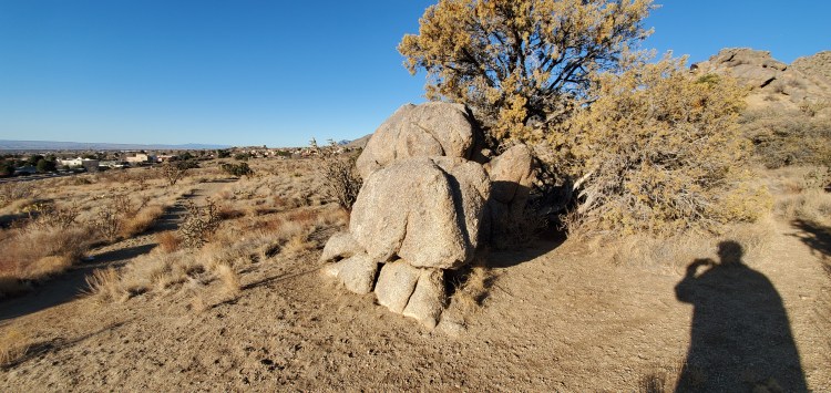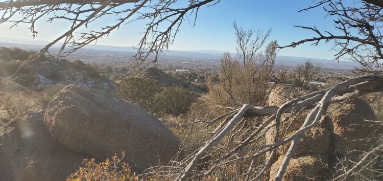 The trail heads east on that first quarter mile, then hangs a right south just as soon as you pass the border into the Sandia National Forest. It was truly a desert landscape as I tread through rocks, cacti and sagebrush. As I reached the highest elevation I would attain on this hike at just under 6,100 feet above sea level, I paused to snap a few pics.