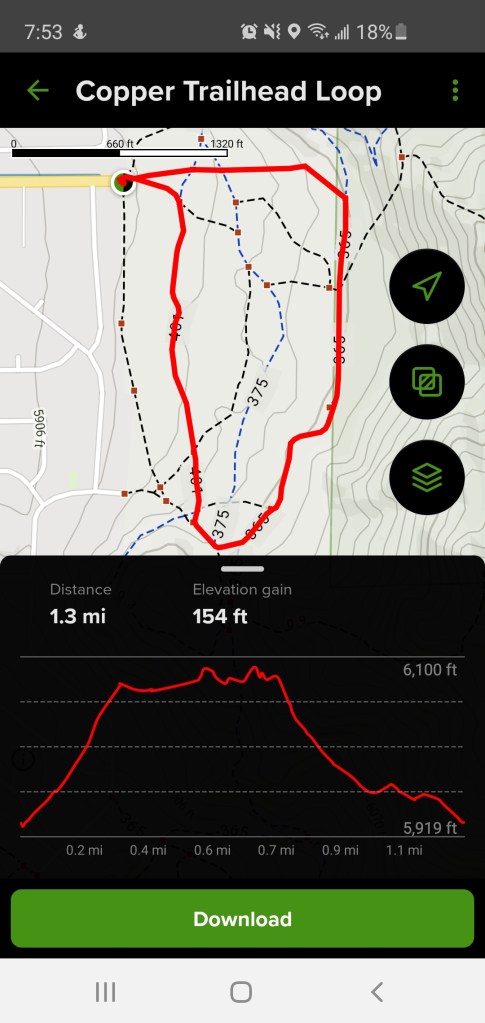 Dressed in jeans, an undershirt, a t-shirt, a flannel, wool socks and my hiking shoes, I arrived at the Copper Trailhead right at 3:00, pulled up the trail on AllTrails and set out. It was a sunny day and, at 55 degrees, a little warmer than I was expecting.